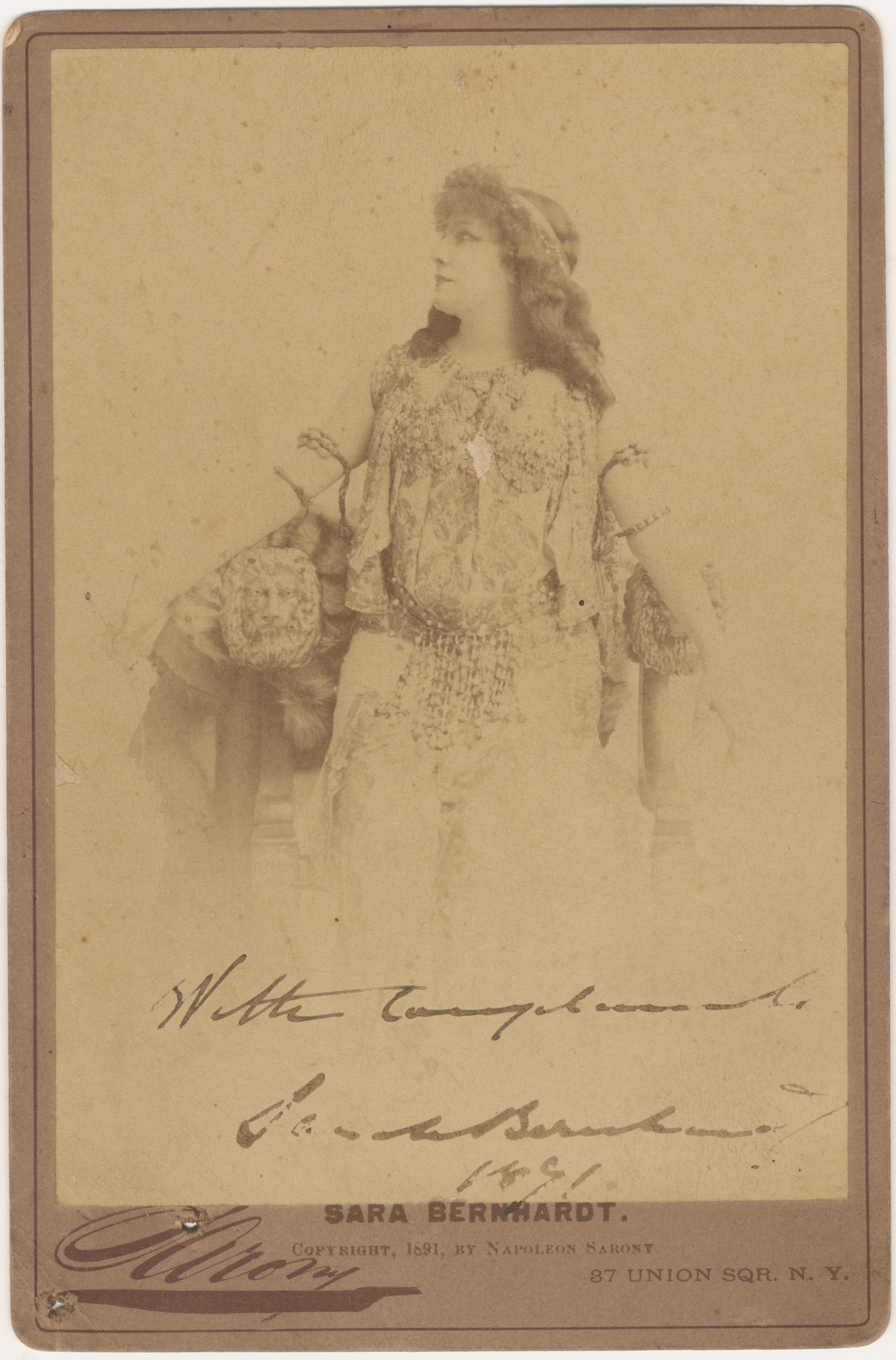 Cabinet card of Sarah Bernhardt as Cleopatra, 1891. Photograph by Napoleon Sabony, New York. Gift of the Estate of Christopher Wood, 2016.