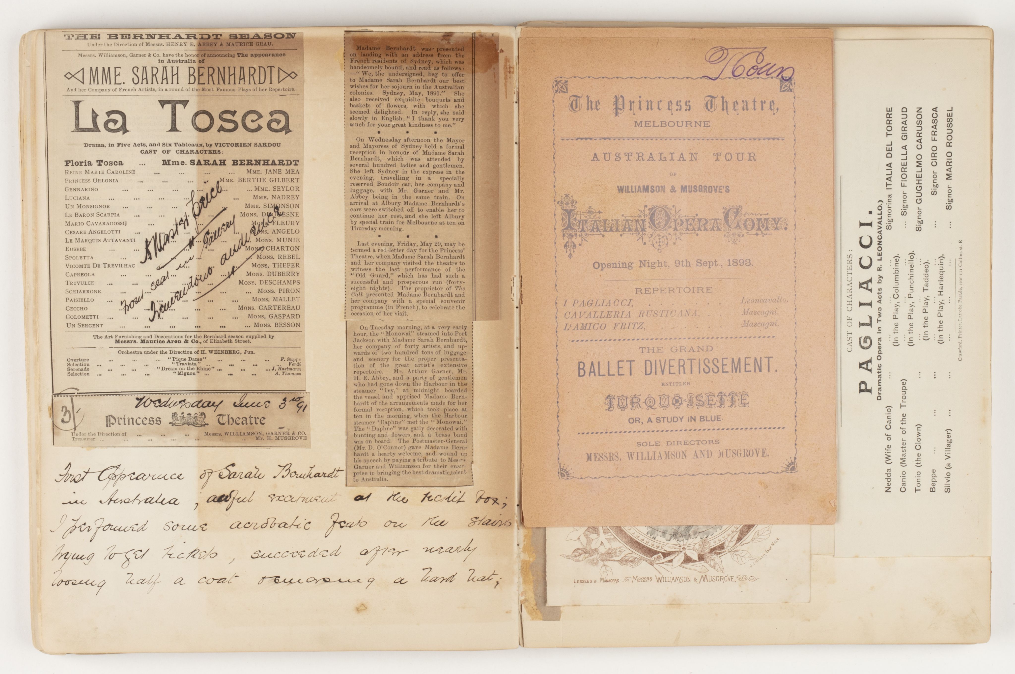 An example of this fan frenzy was recorded in a scrapbook collected by Lady Tait, which documents one of Bernhardt's performances in La Tosca, staged at the Princess Theatre in Melbourne.